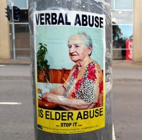 Pedestrian pole poster addressing the issue of verbal abuse of the elderly.